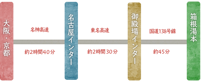 新大阪 ~ 【JR東海道新幹線 ひかり号 約1時間46分】 ~ 静岡 ~ 【JR東海道新幹線 こだま号 約48分】 ~ 小田原 ~ 【箱根登山鉄道 約16分】 ~ 箱根湯本